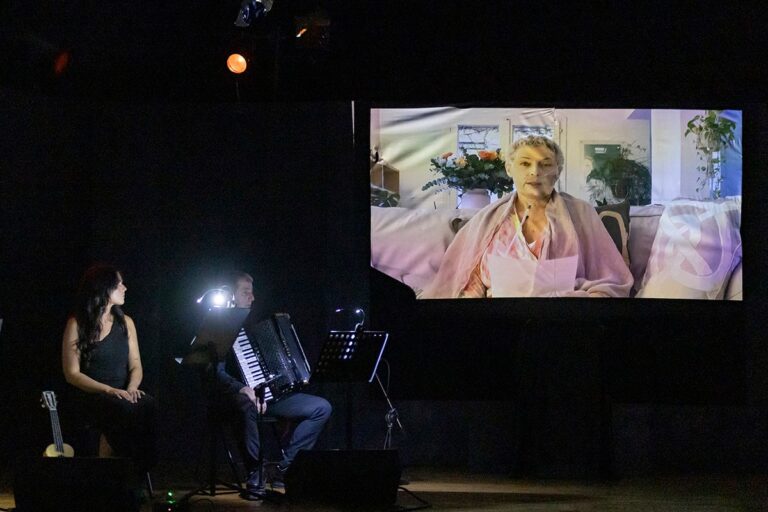 Lo spettacolo, costruito come un monologo documentario, intreccia parola, musica e materiale video. In scena, insieme alla Petrini, la presenza emotiva e sonora del violoncello di Pasquale Filastò, la voce limpida di Paola Bivona, la fisarmonica di Alessio Podestà: intermezzi musicali che non alleggeriscono, ma permettono al pubblico di respirare, di elaborare ciò che ha appena ascoltato. La direzione artistica di Norma Martelli tiene insieme racconto giornalistico e partitura emotiva con grande delicatezza.