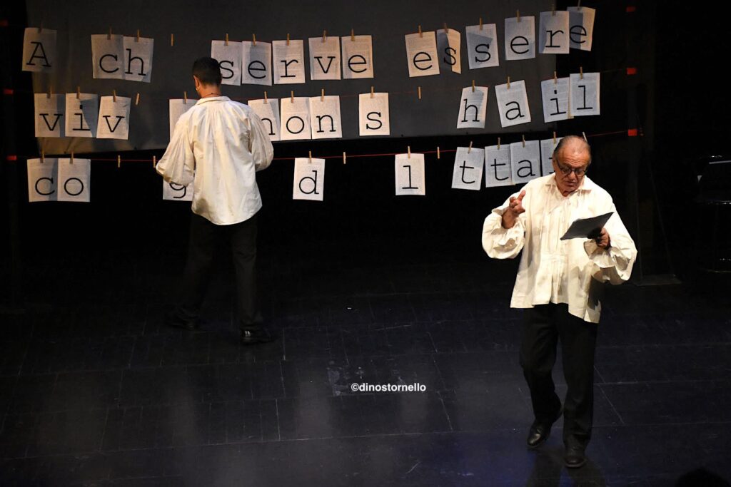 Una potenza in divenire di un prodotto non finito, uno spettacolo attualmente in fase di realizzazione, con un’imbastitura scenografica e sonora che già da adesso non lascia dubbi. Sul piano dell’allestimento, lo spazio in fondo al palcoscenico, in primo luogo, viene attrezzato per convertirsi in stenditoio, vale a dire in uno di quegli ambienti collettivi dove si adagiano gli indumenti perchè asciughino. Ma qui non ci sono indumenti da asciugare; a sostituirli grafemi, singole lettere, costellazioni vaganti di segni alfabetici, dapprima criptici e sospesi e, successivamente, leggibili e significanti. Sono diramazioni di Pippo che in scena respirano, ed enunciano e adducono, esprimono e dicono: addottrinano. Sono lì per interrogare e convocare, dai più adulti ai più giovani, nell’ardire di resistere, l’ardimento di avversare e la prodezza di ribellarsi e boicottare. A che serve esistere senza il coraggio di lottare?