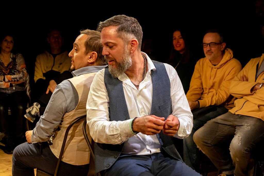 La struttura dello spettacolo favorisce l’emergere di una narrazione che è sempre limitata nel tempo (50 minuti segnati da un orologio digitale in bella vista del pubblico, due sedie, una storia — cifra minimale che agevola l’atto creativo) e profondamente radicata nel presente. Ciò che colpisce è la chiarezza del gesto: ogni scelta emotiva o comica nasce da un ascolto reciproco profondissimo; quando uno dei due prende un segnale, l’altro non lo rincorre meccanicamente ma lo trasforma, lo mette alla prova, lo smonta e lo ricompone. Il risultato è una catena continua di invenzioni che, pur essendo imprevedibili, appaiono sempre fondate, coerenti, e soprattutto oneste.