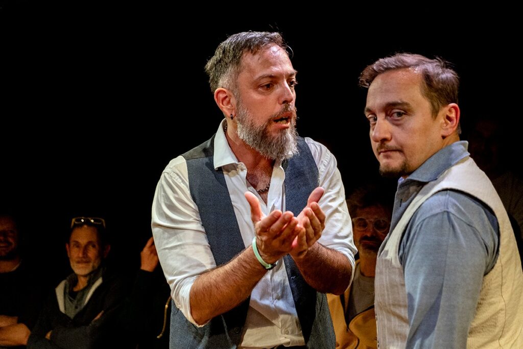 Cossa e Lo Bello dominano lo spazio con una totale padronanza: si completano, si contraddicono, si sfidano come due schermidori che si conoscono a memoria. La loro intesa è la chiave di tutto. Dietro la spontaneità apparente si sente l’allenamento, la fiducia, la disciplina di chi sa ascoltare prima ancora di agire. L’improvvisazione non è caos: è artigianato in tempo reale, e i due lo dimostrano scena dopo scena, battuta dopo battuta. La precisa regia di Giuntoli fa da bussola invisibile. Impone limiti – due interpreti, un tempo definito, nessuna trama – e lascia che dentro quei confini esploda la libertà. È una regia che non si vede, ma si sente: nel ritmo, nel respiro, nella costruzione di un arco emotivo che, pur nascendo dal nulla, arriva sempre da qualche parte.