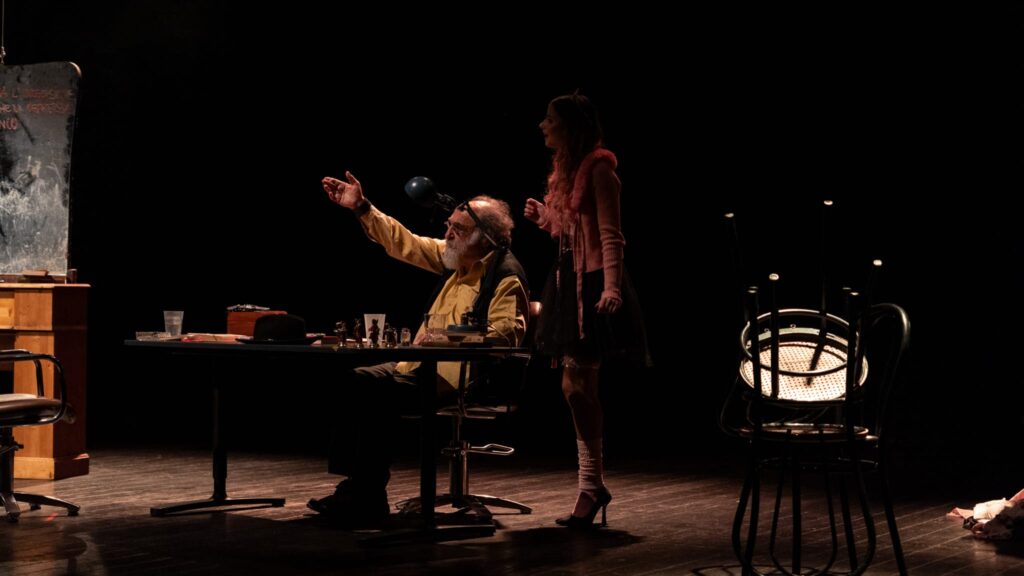 La scena si apre su quello che dovrebbe sembrare uno studio di psicologia, ma che in realtà ha l’aspetto di un bunker fumoso, con luci soffuse e qualche dettaglio sparso. Al centro, un uomo, un dottore senza camice dalle domande taglienti e con la giusta cura a portata di mano per i suoi pazienti. Al suo fianco c’è soltanto un’appariscente segretaria che ha l’aria di essere un’influencer mancata, rivestita di lustrini e sogni materiali. Nel frattempo, secondo un movimento che va dalla platea al palcoscenico, sfila una sfilza di personaggi ambigui e particolari, affinché lo psicologo dia loro la giusta terapia. Con questa ambientazione un po’ noir e misteriosa, Lo Psicologo, con Alessandro Haber, si presenta al pubblico come un progetto sperimentale d’avanguardia.