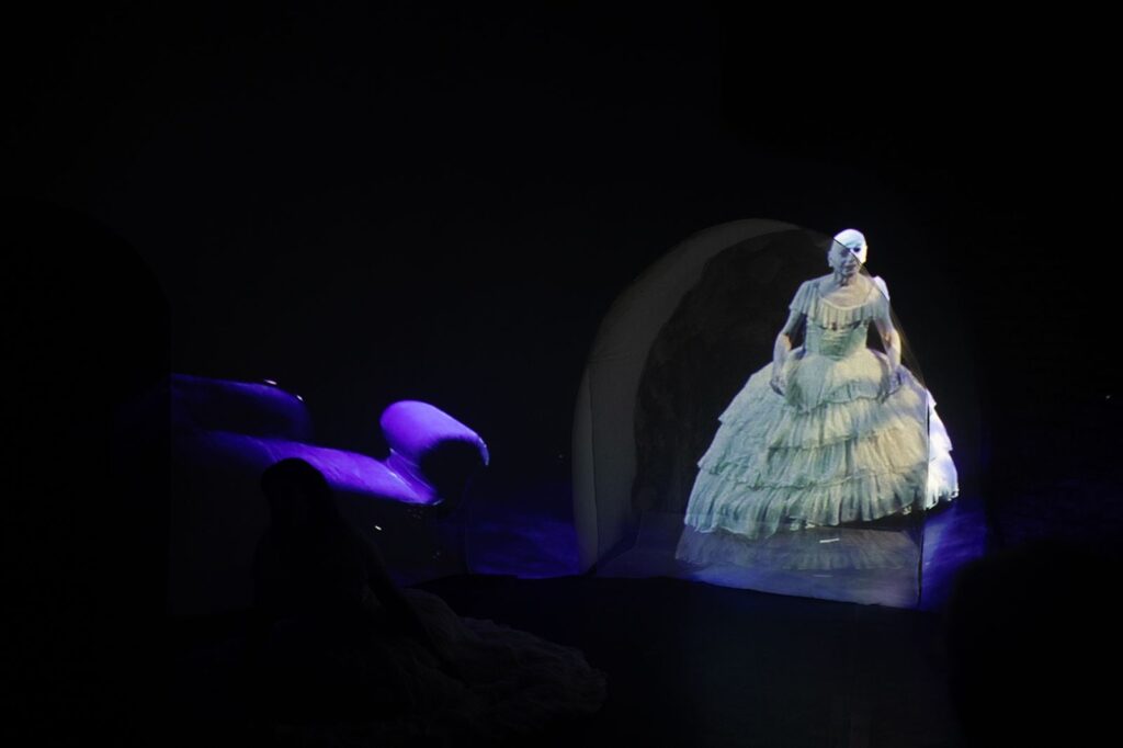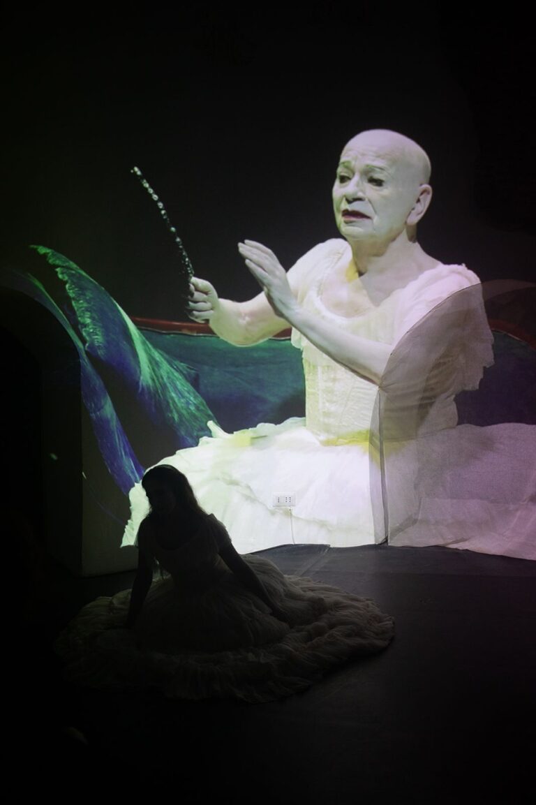 A intervallare le varie coreografie e i cambi d’abito della performer, appare proprio lui, Lindsay Kemp, che prende vita nelle proiezioni di immagini lungo i muri antichi della sala che evocano alcune delle sue più celebri esibizioni. Sembra di vederlo fluttuare come un fantasma buono a sostenere un duetto danzante con la sua compagna di scena, come un Maestro di Cerimonie che apre le danze e lascia il testimone della sua nobile arte ai seguaci della Lindsay Kemp Company.