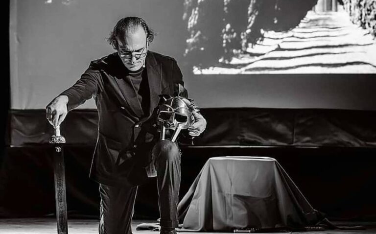 All’Arena del Mare, a Genova, lo spettacolo ha trovato la sua cornice ideale. Il rumore dell’acqua a pochi metri, l’odore salmastro della sera, la luce che si spegne piano sulle sedie di chi ascolta. La scenografia è essenziale: uno schermo, un leggio, un supporto con elmo e spada. L’evento, curato dal Teatro Garage, ha portato in scena non solo un grande artista, ma anche un momento raro di teatro sincero e vibrante, perfettamente integrato nello spirito di questa rassegna estiva. Basta la voce, quella voce, a riempire l’anima, le menti, i cuori degli spettatori.
