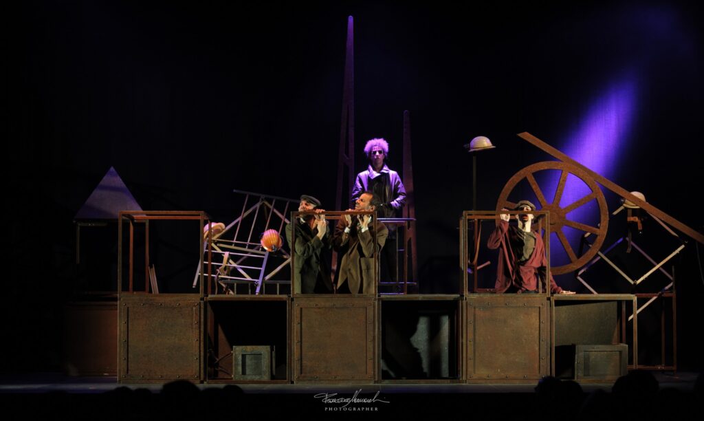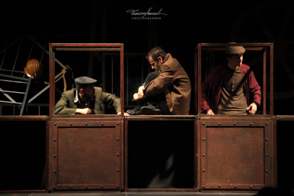 Il cuore visivo dello spettacolo è la scenografia ideata da Alessandro Chiti, complessa e suggestiva. In scena compaiono grandi cubi metallici privi di pareti che gli attori stessi spostano e ricompongono durante lo spettacolo. Con un ritmo perfettamente coordinato, queste strutture diventano di volta in volta i vagoni del treno che porta i minatori in Belgio, l’ascensore che li conduce nelle profondità della miniera o le strette gallerie di lavoro. È un dispositivo scenico dinamico che rende visibile il viaggio e, allo stesso tempo, la prigionia progressiva di quegli uomini.