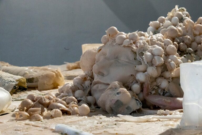 L’installazione traduce questo paradosso in materia: un banchetto sontuoso e al tempo stesso già in rovina, capace di attrarre e respingere, di evocare la festa e il suo epilogo. Il silicone, con la sua consistenza molle ed epidermica, non invita solo a guardare, ma stimola anche una percezione tattile. La mostra diventa un paesaggio da esplorare con la pelle, una superficie comune che rende lo spettatore partecipe di un corpo collettivo.