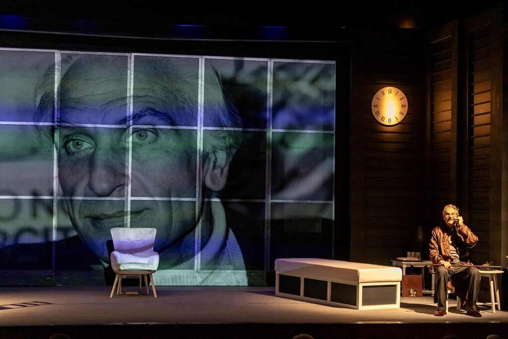 Fondamentale, in questo percorso, la scenografia: semplice ma di grande potenza visiva, capace di trasformare il palco in un archivio della memoria. Le proiezioni, che mostrano filmati d’epoca, immagini di Pannella o dei pescatori siciliani durante Lu pisci spada, arricchiscono lo spettacolo senza appesantirlo, conferendo una dimensione storica e documentaria che amplifica il valore evocativo della musica e della recitazione. La vetrata sul mare, simbolo dell’ultima dimora di Modugno, diventa lo schermo sul quale passato e presente si sovrappongono, fondendo realtà e sogno.