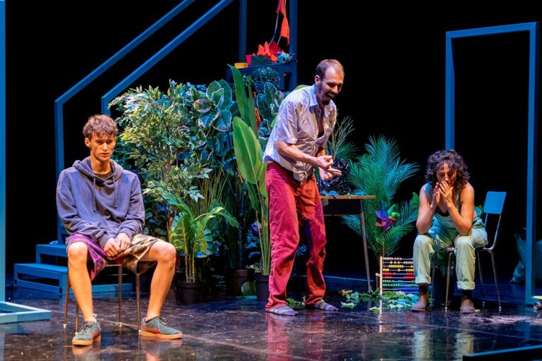 La scenografia e il sapiente dosaggio delle luci contribuiscono in maniera decisiva all’efficacia dello spettacolo. Accanto alla presenza viva e muta delle piante, elementi scenici che diventano quasi personaggi con identità propria e nomi propri, emerge la vasca da bagno, luogo simbolico in cui Edda e Rud entrano ed escono continuamente. Essa diventa rifugio, spazio di pensiero, culla arcaica e, al tempo stesso, interrogativo aperto. La vasca suggerisce l’acqua primordiale, l’elemento che protegge la vita nascente, ma rappresenta anche un dispositivo teatrale che stimola domande senza offrire risposte definitive, coinvolgendo lo spettatore in un gioco di senso e interpretazione.