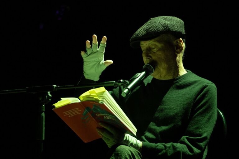Baricco, nel frattempo, accompagna lo spettatore con la sua voce. Non legge soltanto: evoca, costruisce immagini, dà ritmo. Le sue pagine non hanno mai avuto la linearità classica della scrittura, con frasi ordinate e simmetriche; piuttosto, seguono l’andamento dell’oralità, spezzano la riga, imitano il respiro e la voce parlata. Così, anche sul palco, la parola sembra farsi musica, scandita e sospesa. La sua capacità di scomparire dietro la forza evocativa del testo è uno degli elementi che rende unica l’esperienza: ascoltarlo significa vedere le frasi materializzarsi davanti agli occhi.
