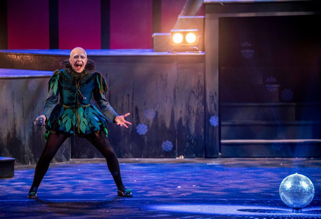 Grottesco, inquietante, sinistro. Un Puck che si amalgama all’alone tenebroso dello spettacolo e anzi ne sembra il principio scatenante. Un Puck che si contorna di strane creature ibride tra Lynch e Tolkien. E parlando del Signore degli Anelli, sembra ereditare tanto da Gollum/Sméagol, sia nel portamento impacciato, sia nella modulazione della voce, una voce gutturale, stridula, rauca che nel dire una frase innocente come “La mia signora” ricorda quel “Il mio tesoro”. Una voce che nasconde un suono innocente e femminile che viene stravolto e deformato ottenendo un effetto macabro e perturbante. Melania Giglio lavora con maestria su questa caratterizzazione, reinventa la propria fisicità in modo incredibile, si trasforma in una creatura piccola e repellente dalla mente astuta e il fascino conturbante, la cui potenza vocale esplode in energici momenti di musica in stile opera rock dal canto che tutto travolge.