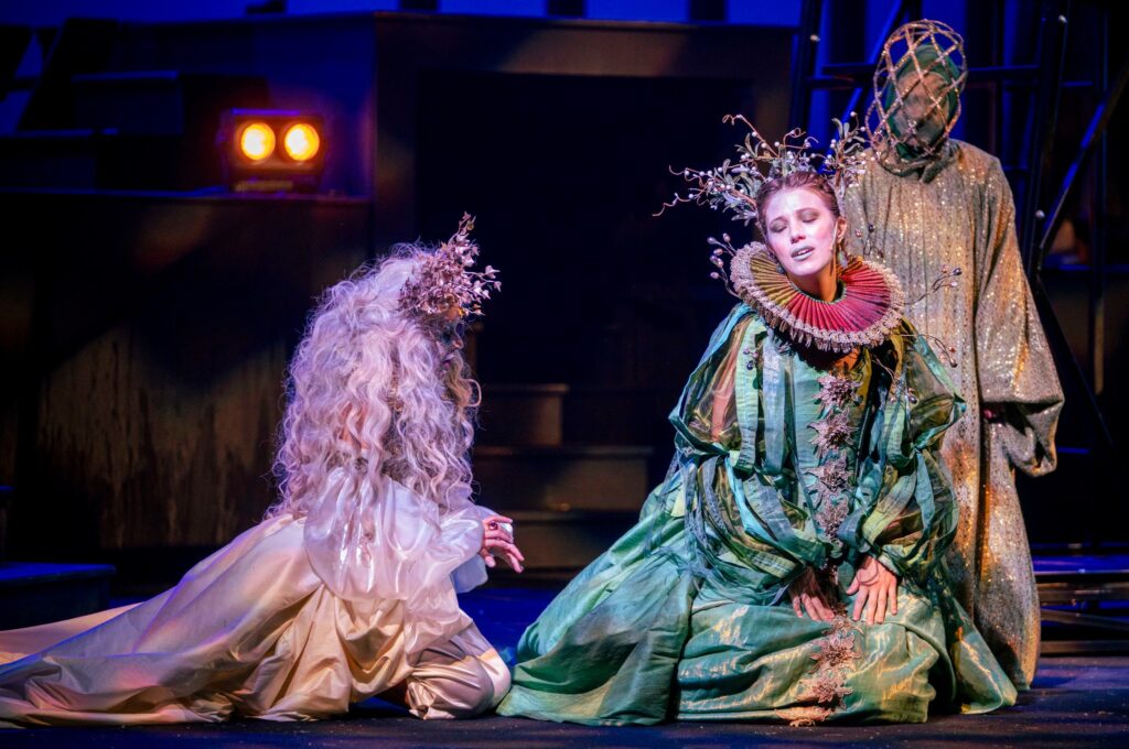 Fondamentale il maestoso lavoro del costumista Daniele Gelsi, a cui abbiamo anche dedicato un’intervista a riguardo, che crea due macrocosmi visivi: quello della corte e quello boschivo. Il primo è contraddistinto dall’aderenza a una iconografia elisabettiana con spiragli di licenze e libertà creative e adopera colori scuri, principalmente neri e viola, che accentuano un carattere rigoroso, austero e tetro. Quello boschivo si definisce in una maggiore autonomia espressiva rispetto alla ricostruzione del costume storico: un estro creativo abbraccia verdi e colori chiari, forme e materiali come sete e garza che di fatto restituiscono una sensazione di leggerezza, evanescenza e spontaneità che altro non è che il dominio della fantasia e dell’immaginazione.